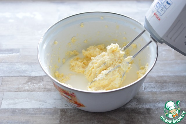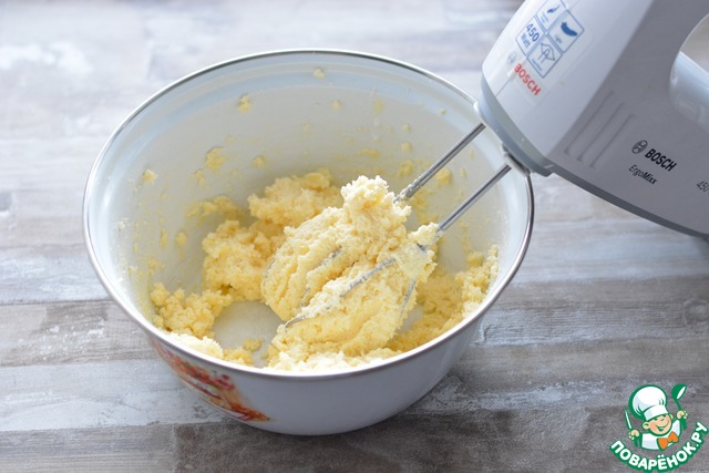 Мягкий маргарин, взбейте до пышности с солью, сахаром и ванилином