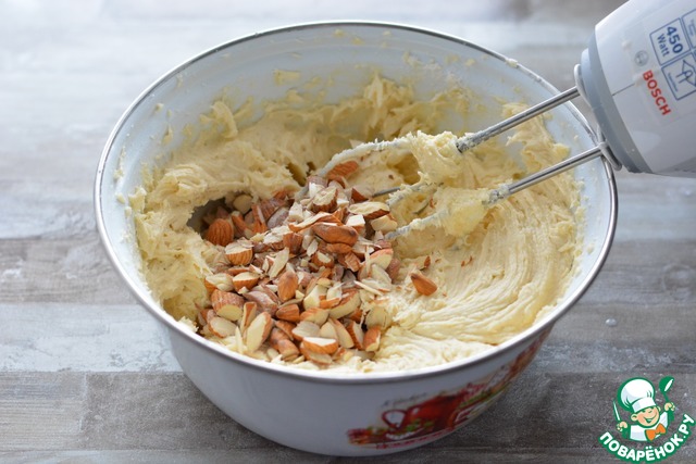 Добавьте в тесто нарубленный миндаль и коньяк. Еще раз соедините всё на малых оборотах миксера, чтобы орехи равномерно распределились в тесте.