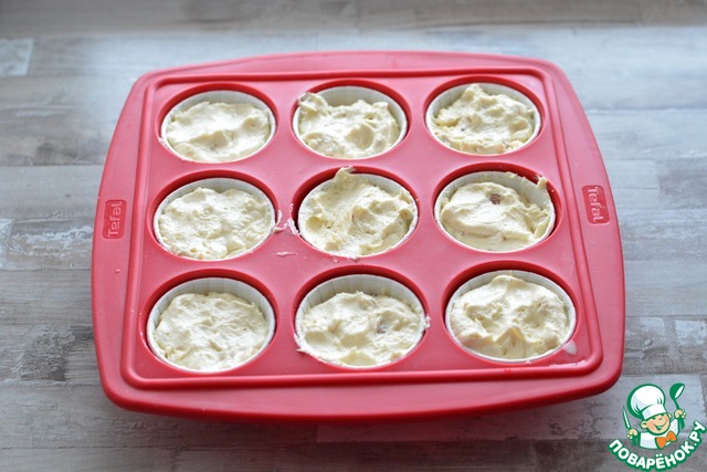 Разложите тесто по формочкам. Поставьте в холодную духовку, включите её на 160°С, выпекайте кексы около 15-20 минут до готовности. Проверяйте готовность, проткнув зубочисткой.