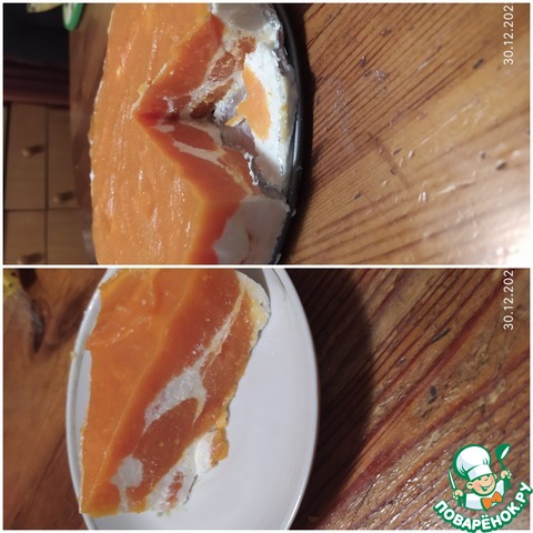 Творожная масса закончится первой, так как её меньше. Верх десерта залить оставшейся морковной массой. Накрыть пищевой плёнкой и убрать на ночь в холодильник.