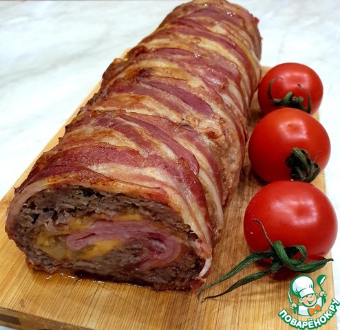 Посыпьте сыром (150 г), отступив немного от краёв, сверху разложите тонкие кусочки ветчины, жареный лук и посыпьте оставшемся сыром. Сверните рулет. На пищевой плёнке выложите внахлест ломтики бекона (в виде ёлочки) Поверх ломтиков положите рулет из фарша и оберните его беконом. Заверните в фольгу. И запекайте в разогретой духовке до 200° С, в течение 50 минут + 10-15 минут без фольги.