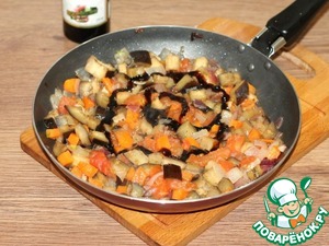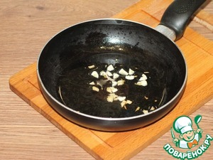 5. На сковороду наливаем растительное масло и разогреваем. Обжариваем лук и чеснок (1 зуб.) до прозрачности. Добавляем кубиками морковь и жарим до готовности.