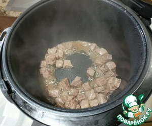 Отправляем в чашу масло и говядину (если нравиться обжаренный лук, то и его) — Режим «Жарка» 12 минут.