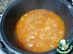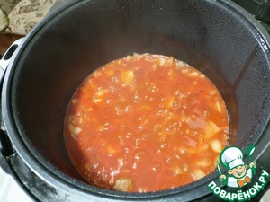 Добавляем в чашу 500мл воды, ткемали, рис, лук, томатную пасту — Режим «Тушение» 30 минут.