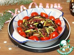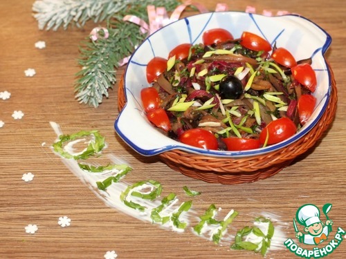 11. Через 2 часа переложить овощи в салатник, украсить перьями зеленого лука, дольками помидора черри и подавать. Подавать как закуску с обжаренными кусочками хлеба.