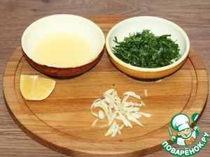 2. Из лимона выдавить 2 ст. ложки сока. Зелень мелко порубить и перетереть с маленькой щепоткой соли до выделения сока. Чеснок нарезать соломкой.