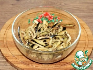 4. Пересыпать брусочки баклажана солью и поставить миску в сторону, минут на 20.