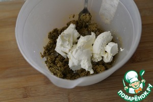 Пробиваем паштет блендером. От этого количества берём четверть, так как там много, добавляем сливки и творожный сыр. И ещё раз пробиваем блендером.