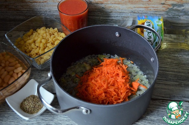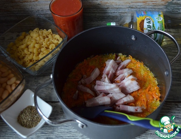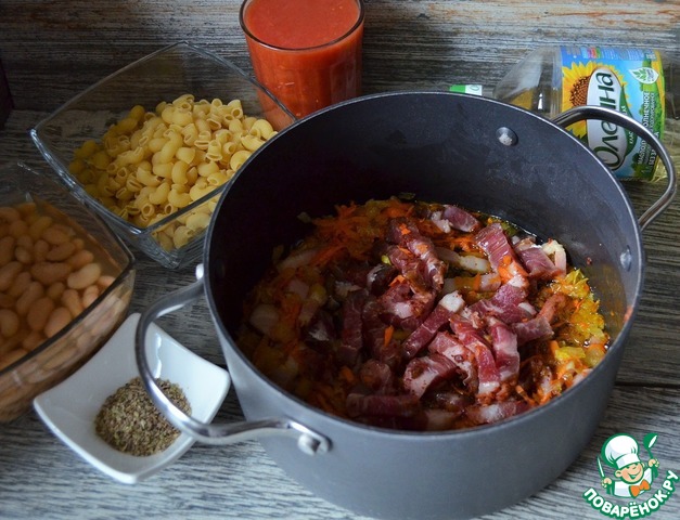 Приготовить продукты. Строгого рецепта не существует, в каждой итальянской семье свой вариант. Главное, фасоль и паста.