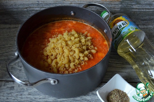 Влить 2 стакана кипятка, добавить макаронные изделия. Варить при минимальном нагреве 5-7 минут. Желательно чтоб размер макаронных изделий совпадал с размером фасоли. Варить до готовности. Посолить по вкусу.