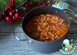 Влить томатный соус, добавить фасоль. Тушить при минимальном нагреве 3-5 минут.