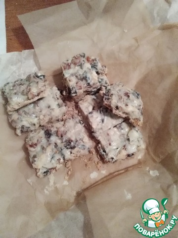 Этот десерт истинное наслаждение для всех любителей сладкого. Откусив один кусочек, непременно захочется второй, а детвора от этой сладости совершенно точно не сможет оторваться. Готовится все предельно просто и очень быстро. Структура десерта достаточно плотная, но не похожа на обычную плитку шоколада, это другой десерт, он намного мягче и нежнее, режется легко. Сочетание грецких орехов, кураги, изюма, чернослива с белым шоколадом и сгущенкой, да еще при этом с выпечкой из песочного теста, безусловно очень вкусно.
