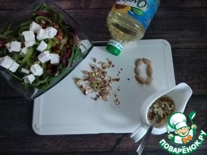 Микс салатов помыла, обсушила и выложила в салатник. На него - нут в специях. Порезала тонко болгарский зелёный перец, отправила туда же. Брынзу порезала небольшим кубиком, добавила к салату. Фисташки очистила и мелко порубила. Ими посыплю уже заправленный салат. Делаем заправку. Чеснок мелко рубим. Масло подсолнечное ТМ Олейна, уксус винный, дижонскую горчицу, соль и чеснок соединяем вместе в посуде.