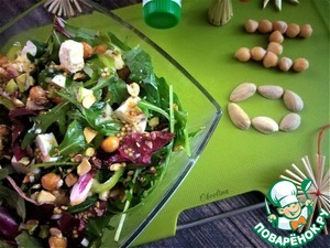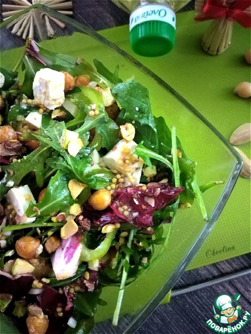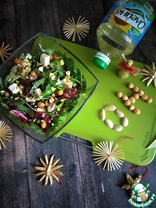 Острый и пикантный салат с нутом, руколой и радиччо, с брынзой и фисташками, заправленный пикантной заправкой. Не останется незамеченным на праздничном столе.