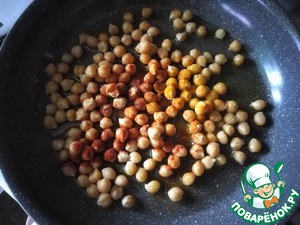 На сковороду наливаем масло, греем его и выкладываем отваренный нут. Добавляем специи: куркуму, перец кайен (любой другой), сладкую паприку, сухой имбирь. Перемешиваем и обжариваем нут буквально пару минут, чтобы он пропитался ароматом специй.