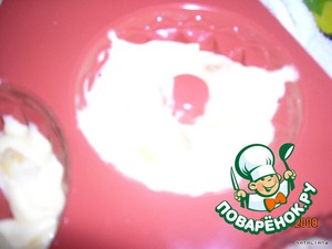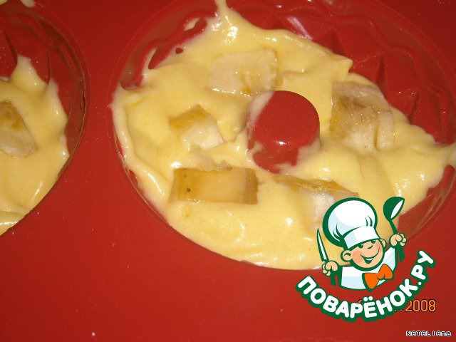 2 яйца взбить. Масло растереть с сахаром, добавить взбитые яйца, кефир, погашенную соду и муку. Тесто должно быть как густая сметана (муки около стакана, чуть больше) В формочки заливаем половину теста.