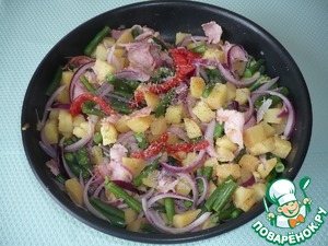 Затем добавить нарезанный лук, стручковую фасоль, посолить по вкусу. Обжаривать на среднем огне постоянно помешивая, около 3-4 минут (лук должен немного карамелизоваться).
