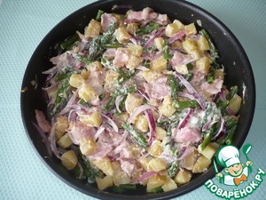 В кипящей подсоленной воде отварить стручковую фасоль (если она заморожена, то предварительно её размораживать не нужно). После закипания воды варим фасоль 5 минут, затем сливаем из кастрюли кипяток и наливаем туда холодную, а лучше ледяную воду. Это поможет сохранить ярко-зелёный цвет стручков. Очищаем лук и нарезаем перьями. Сварившийся и немного остывший картофель очищаем от кожицы и режем кубиками. Небольшими ломтиками нарезать бекон. Помидор конкассе нарезать соломкой (для помидоров конкассе - используется только мякоть томатов, т. е. без кожицы и семян).