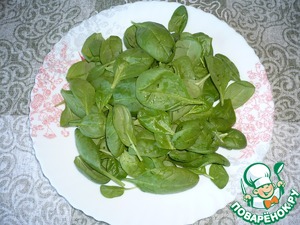 Листья шпината тщательно промойте теплой проточной водой и отряхните от лишней влаги. Поскольку мы используем молодой шпинат, то резать его ненужно, листья итак достаточно небольшого размера.