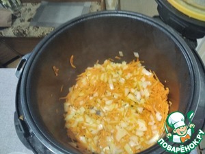 Отправляем в чашу масло, морковь и лук — Режим «Жарка» 7 минут.