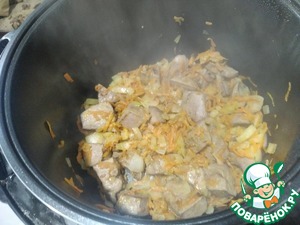 Добавляем в чашу печень — Режим «Жарка» 8 минут.