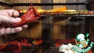 4. Завялить любым доступным способом. Например, прямо в коптильне. Перцы для вялки и копчения разместить разрезом вверх на сетках, решётках и т. д.