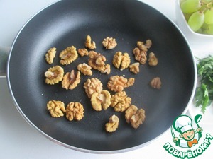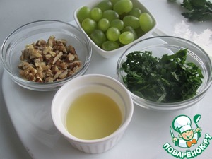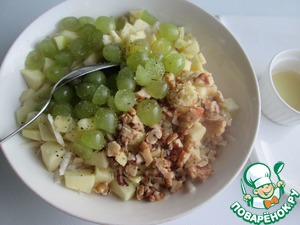 Ягоды винограда разрезать пополам, мелкие можно оставить целыми, а если виноград с косточками, то ягоды разрезать и косточки удалить. Виноград вместе с орехами добавить в салат. Затем посолить, поперчить и перемешать.