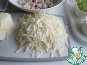 Корень сельдерея вымыть, очистить, натереть на тёрке нужные 100 г и добавить к куриному филе.