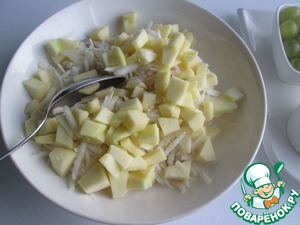Яблоко очистить, нарезать кубиками или соломкой, сбрызнуть лимонным соком и добавить в салатник.