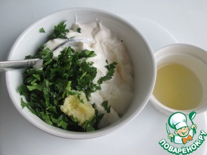 Для приготовления заправки, соединить натуральный йогурт (без добавок), майонез, нарезанную петрушку и выдавить через пресс зубчик чеснока. Добавить лимонный сок и хорошо перемешать.