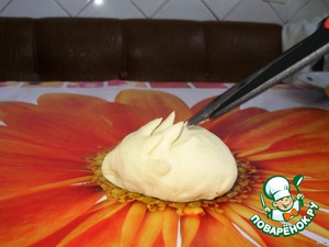 С острого кончика ёжика оставляем мордочку. Берем ножницы и делаем колючки, надрезая только верхний слой теста. Чтобы не достать до начинки.