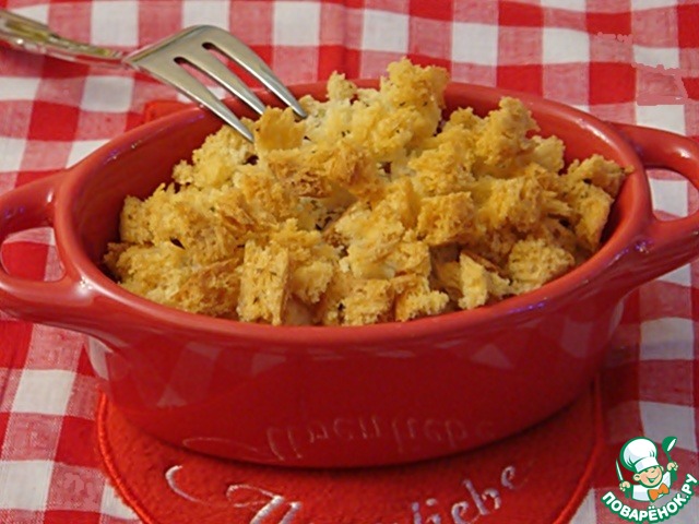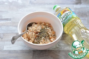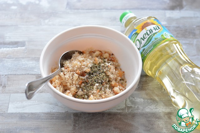Вчерашний белый хлеб раскрошите руками, добавьте к нему орегано и пару ложек масла Олейна, перемешайте