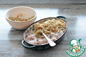 В форму для запекания выложите замаринованные голени, сверху распределите хлебные крошки