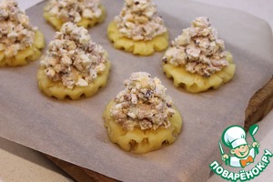 Первым делом нужно достать кольца ананасов из сиропа и выложить на бумажные полотенца, чтобы впитать жидкость. Серединки колец закрыть кусочками ананаса. Фисташки почистить и измельчить.