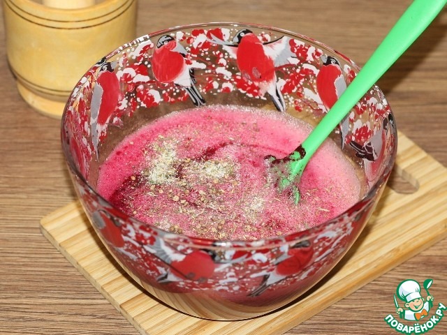 5. Выкладываем в яичную смесь свеклу и добавляем 1 ст. л. растительного масла, молотую приправу (у меня кориандр, зира и сладкая паприка), солим и перчим. Перемешиваем.