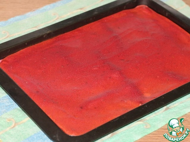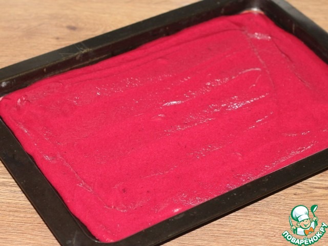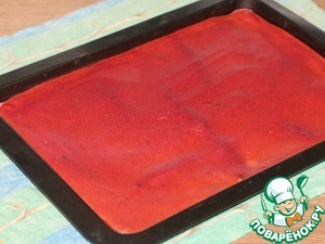 9. Включаем духовку на 180 С. Застилаем противень (32*23 см) пекарской бумагой или силиконовым ковриком и смазываем растительным маслом. У меня силиконовый коврик. Равномерно выкладываем свекольную массу на противень. Выпекаем минут 15-20. Проверяйте готовность сухой спичкой.