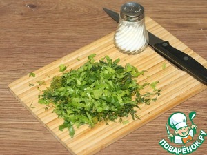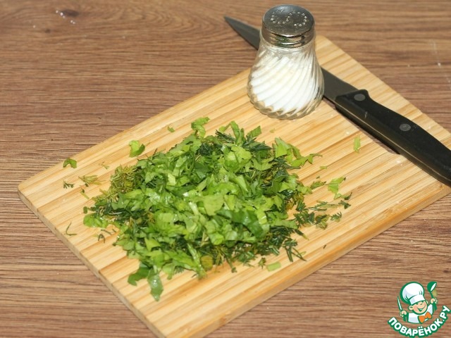 10. Пока выпекается корж, мелко нарезаем зелень и перетираем с маленькой щепоткой соли.