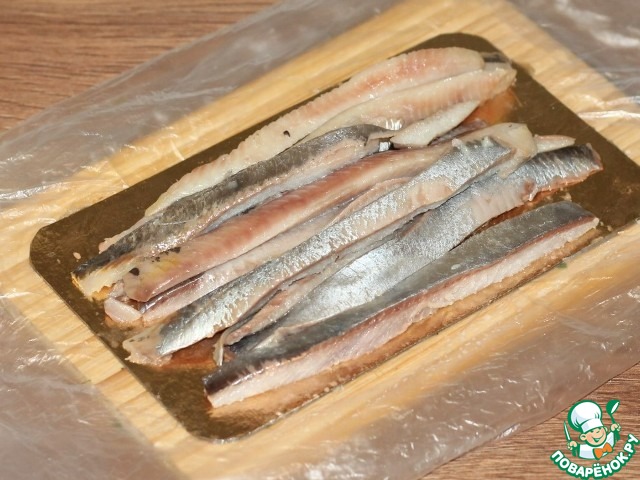 11. Филе сельди, разделенную на половинки, разрезаем полосками. Ширина полосок 2 см.