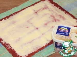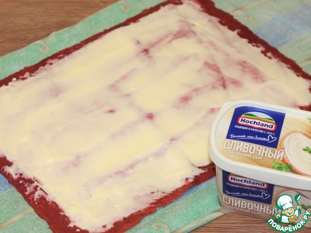 14. Смазываем корж мягким плавленным сыром.