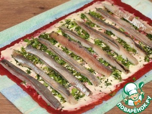 15. Посыпаем зеленью и выкладываем полоски селедки.