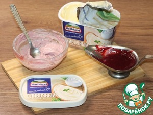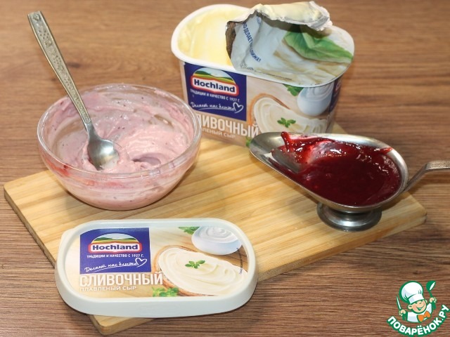 Крем: брусничный острый и пряный соус, смешиваем с мягким плавленным сыром.