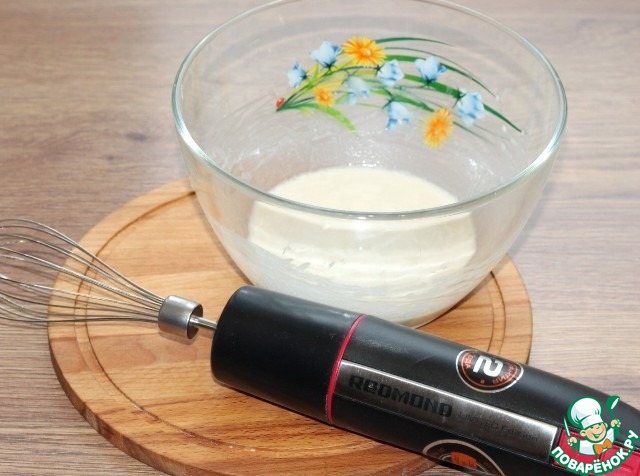 2. Приготовим тесто. В большой миске смешиваем растительное масло с теплым кефиром, опарой, сахаром, ванильным сахаром и солью. Взбиваем миксером. Просеиваем муку в жидкую смесь.
