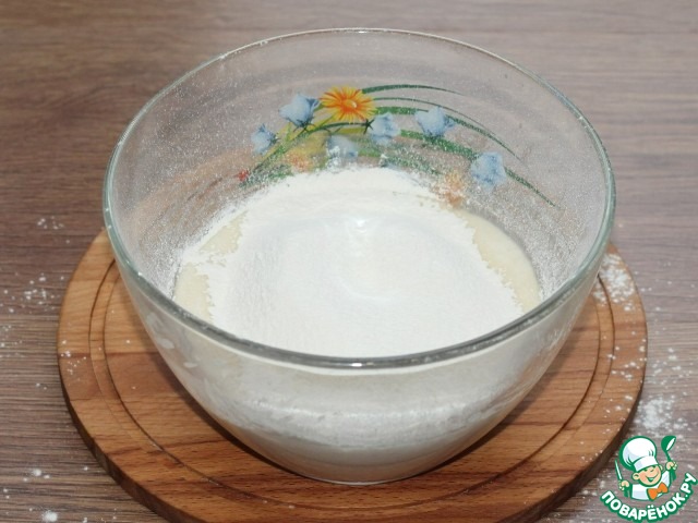 1. Приготовим опару. Смешиваем сухие дрожжи с сахаром и мукой. Добавляем теплую воду и перемешиваем. Ставим опару в теплое место до появления пенной шапочки, минут на 20-30.