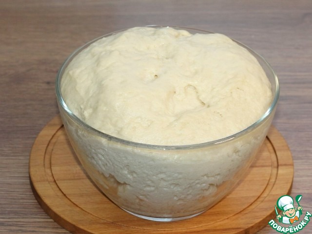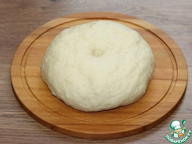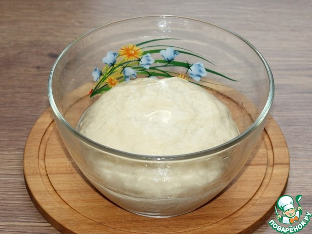 5. Смазываем тесто и миску подсолнечным маслом. Накрываем миску пленкой и ставим в теплое место для подъема теста в 2,5 раза, на 1 час.