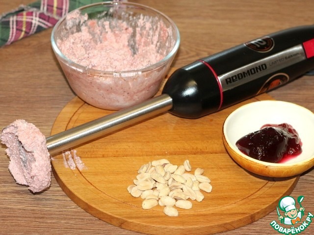 9. Приготовим начинку. Обжариваем орехи на сухой сковороде и измельчаем. Величина помола на ваш вкус. Взбиваем творог со сливочным маслом и протертым джемом. Добавляем измельченные орехи. Начинка должна быть густой. По желанию можно подсластить.