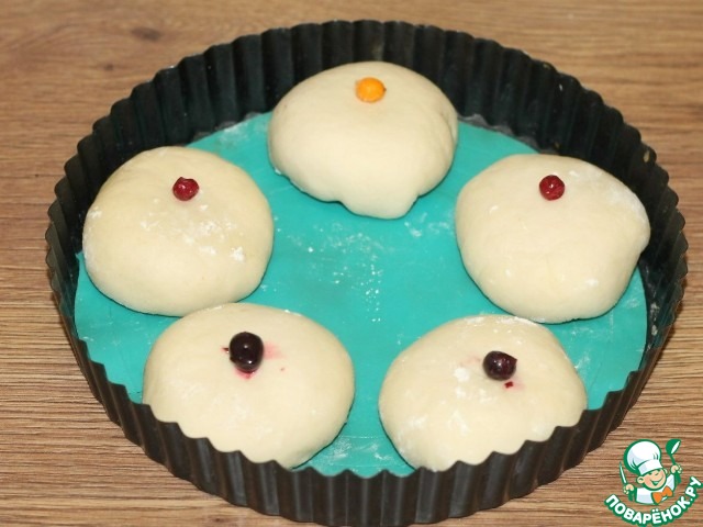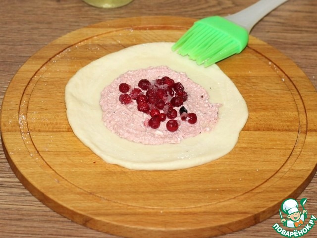 10. Каждую часть теста раскатываем в лепешку. Смазываем начинкой и кладем по 1 ст. л. замороженных ягод. Собираем тесто в круг, как манты, подкручиваем, переворачиваем и припыляем мукой дно.