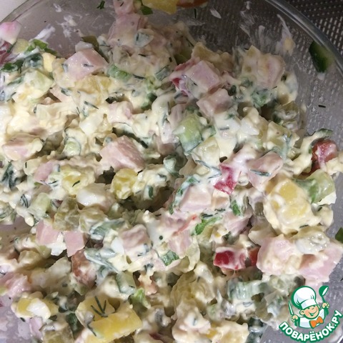 Добавляем йогурт, майонез, соль, смесь перцев, тщательно перемешиваем. У меня получилось это сделать вилкой.
