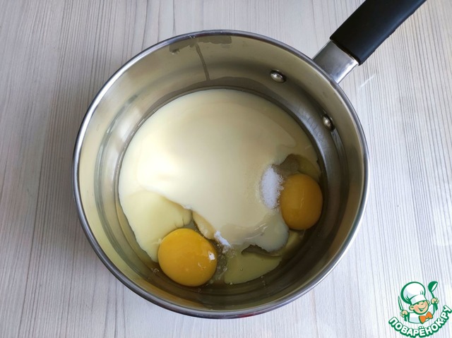 В сотейник с толстым дном добавить яйца (2 шт.), добавить сахар (60 гр.), добавить ванильный сахар (10 гр.)