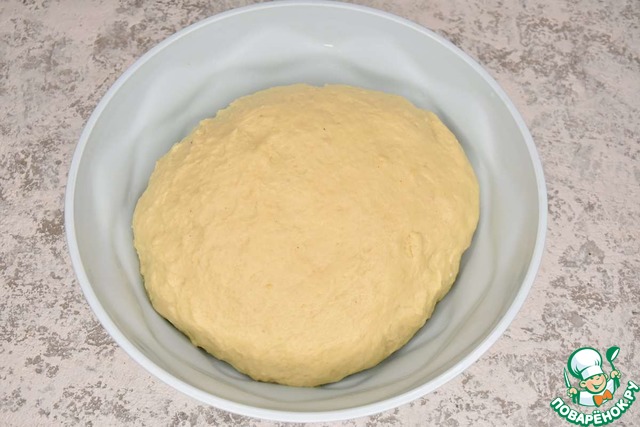 Вымешивать тесто тщательно и долго. Тесто получается однородное, гладкое, мягкое и слегка липкое. Убрать его в теплое место минут на 40, накрыв кухонным полотенцем.
