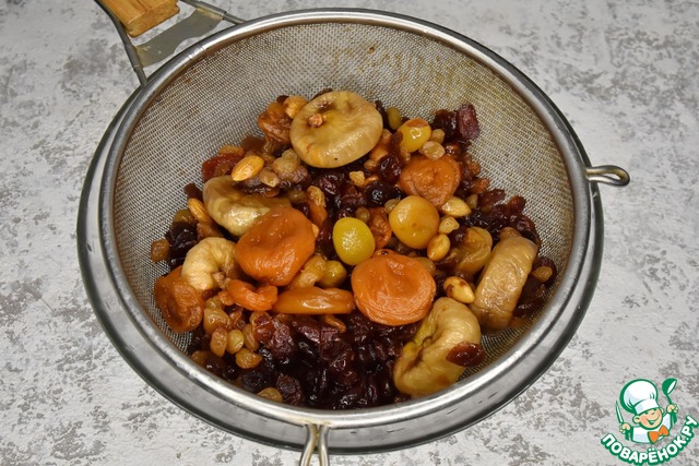 Сухофрукты и орехи откинуть на сито, чтобы стекла лишняя влага. Можно разложить их на бумажном полотенце.